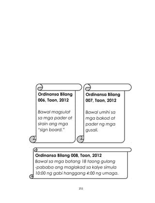 Natatanging Ordinansa ng Taon - Ordinansa Blg16- 2010 na akda ni Kagawad Ricardo C. Mga Pagsusundon Manongod sa mga Nazireo Pinagbotan nin Kagurangnan si Moises na itao an minasunod na mga katukdoan sa mga Israelita. Ordinansa Bilang 004 Taon 2012 Bawal sa tumawid sa hindi tamang tawiran o hindi pedestrian lane 13.